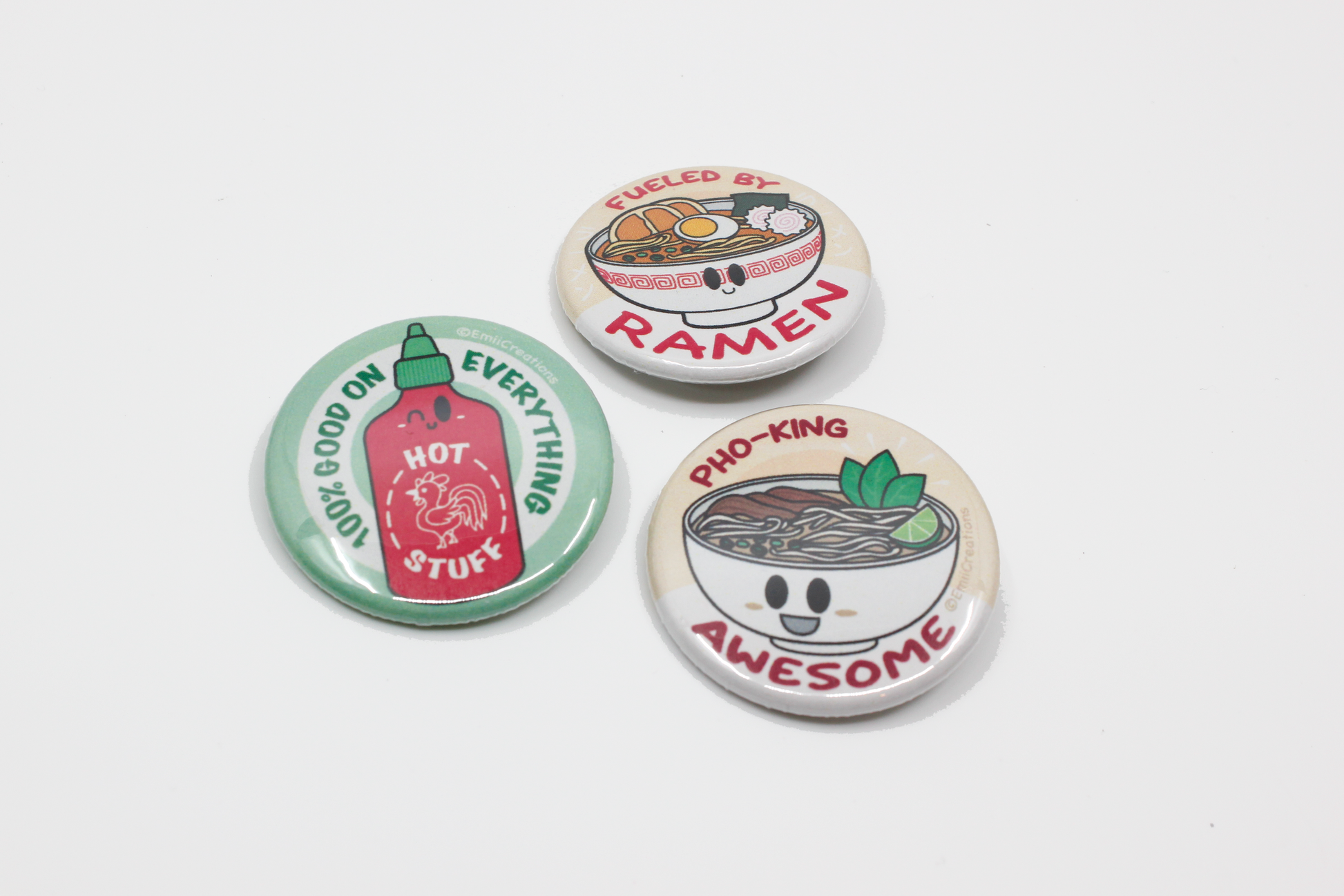 Take our noodle pack to-go. Two bowls of noodles and some hot stuff for some added flavor served on a themed paper backing. They go great on backpacks, lanyards, jackets, scarves, and basically any pin-able surface you may want to add a little spice to. A perfect way to brighten your or a loved one’s day and remind them to look forward to their next lunch break and that next bowl of pho or ramen.